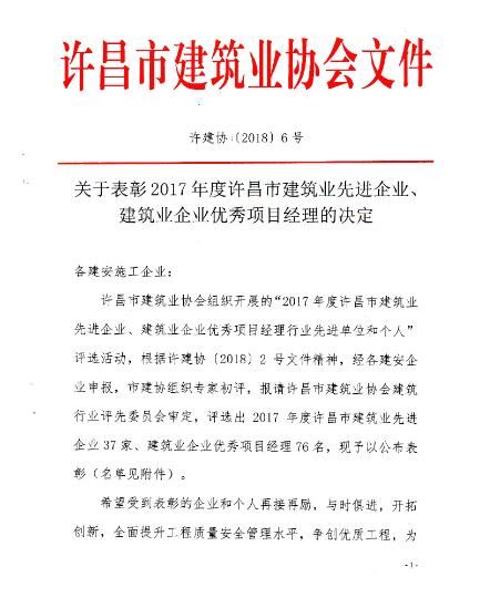 熱烈祝賀我公司被評(píng)選為2017年度許昌市建筑業(yè)先進(jìn)企業(yè)
