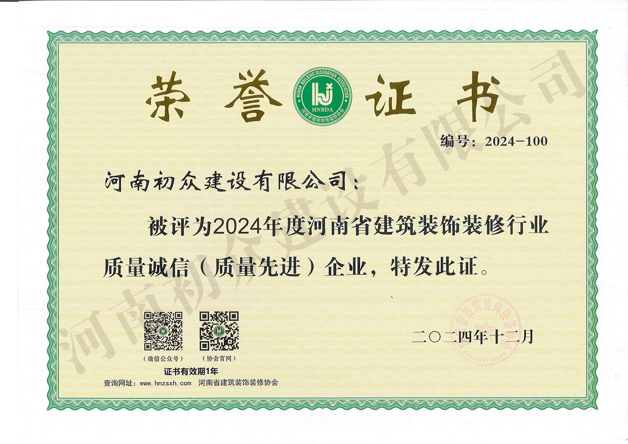 2024年度河南省建筑裝飾裝修行業(yè)質(zhì)量誠(chéng)信(質(zhì)量先進(jìn))企業(yè)